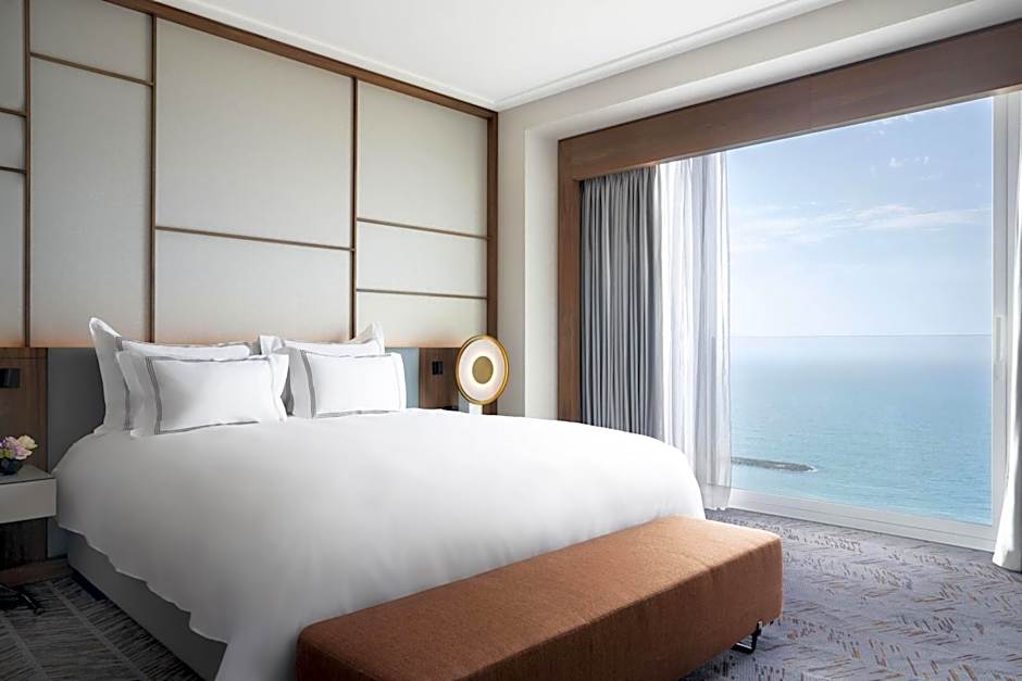 Signature suite with unique Mediterranean sea view, expansive living room with dining area, and kitchenette. Includes access to Horizon Lounge on floor 22 (age 13+).